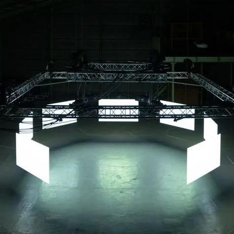 A SURGE OF ACTIVITY AS PERIPHERAL LED SCREENS SHIFT POSITION, FILLING THE SHOT'S BACKGROUND. FRAMING THE CYCLIST AGAINST THE GLOWING SCREEN